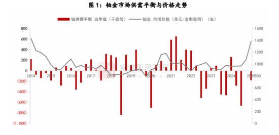 根据WPIC数据,2021-2025年(含预测值)全球铂金供需平衡分别为42.3、30.7、-20.1、-26.6、-19.6吨。2023年,铂金平衡由过剩转为紧缺,主因需求同比增加24.6%,增量主要体现在投资需求。虽然铂金投资需求在总需求中占比不高(仅约为9%),但需求弹性显著,近五年间呈现剧烈波动特征。铂金具备一定的金融属性,与黄金等贵金属走势具有较高联动性,对宏观因素的敏感程度较强。